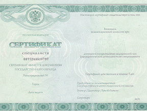 Лицам, получившим среднее или высшее профессиональное медицинское или фармацевтическое образование в Российской Федерации, сертификат выдается государственными образовательными или научнымиорганизациями в соответствии с лицензией на осуществление образовательной деятельности. При оформлении заявки на медицинский сертификат специалиста В указываете сами название какого образовательного учреждения, где пройдена сертификация и количество часов , необходимо внести в новый документ. Персональный менеджер всегда поможет, при необходимости выбрать учебный центр в Москве. Медицинский сертификат специалиста для Вас будет выполнен на бланке типографии ГОЗНАК, который исключает все сомнения по поводу подлинности документа.